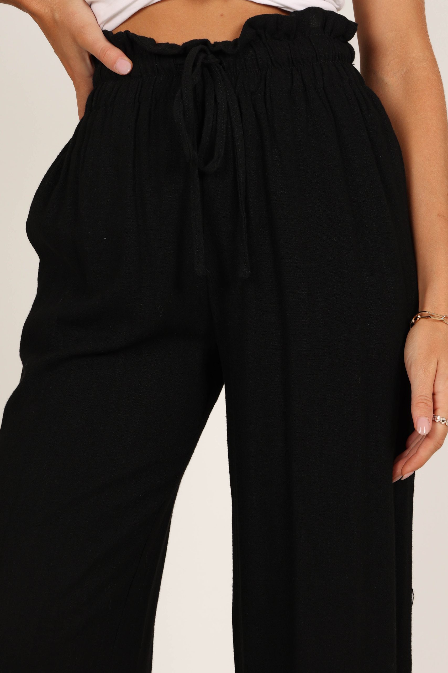 Introducing the versatile pant of the season – our high waisted linen blend pant featuring an elasticised ruffle waistband and drawstring tie. Perfect for dressing up or down, these pants are sure to be a wardrobe staple! high waisted elasticised ruffle waistband drawstring waist tie side pockets unlined